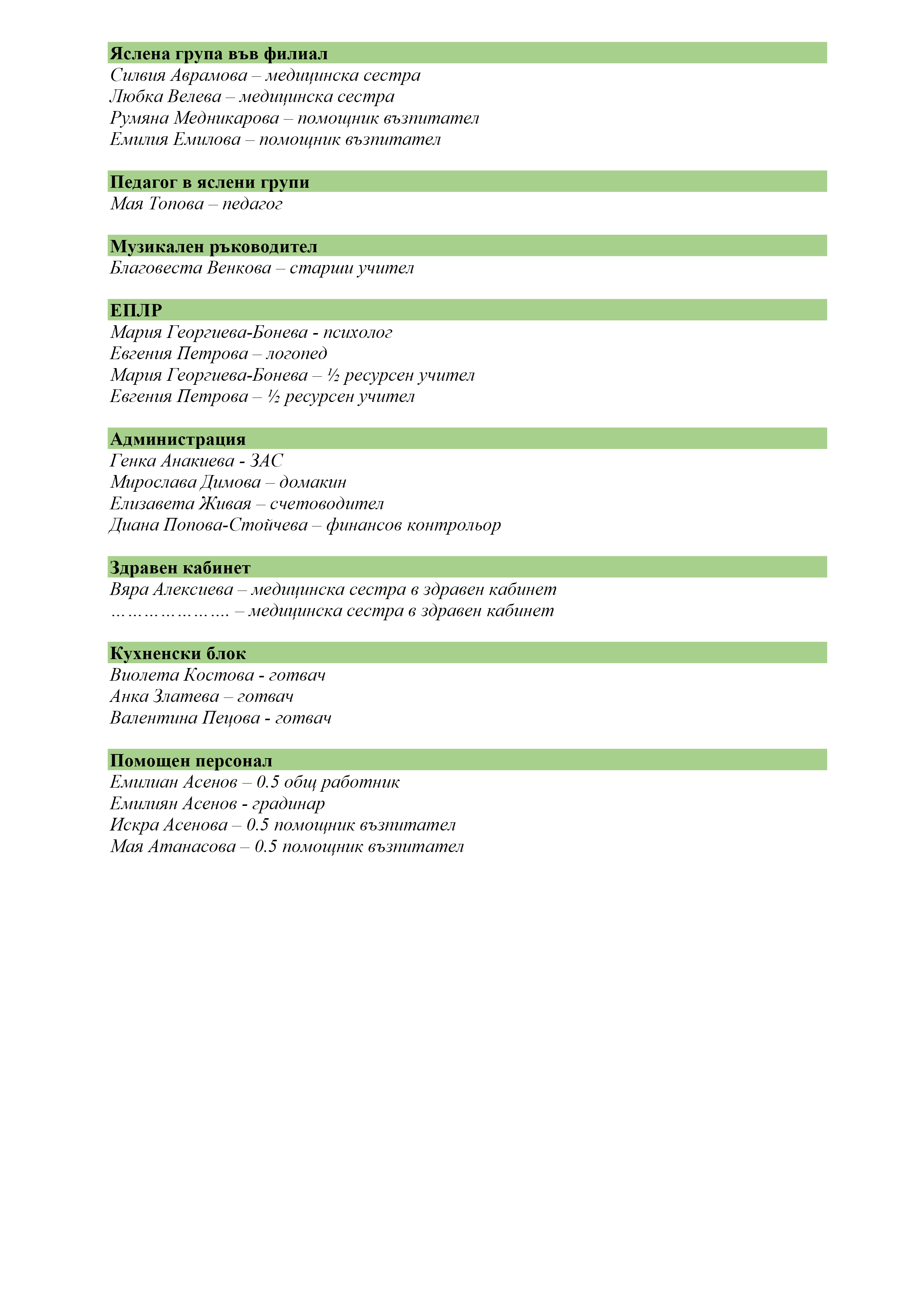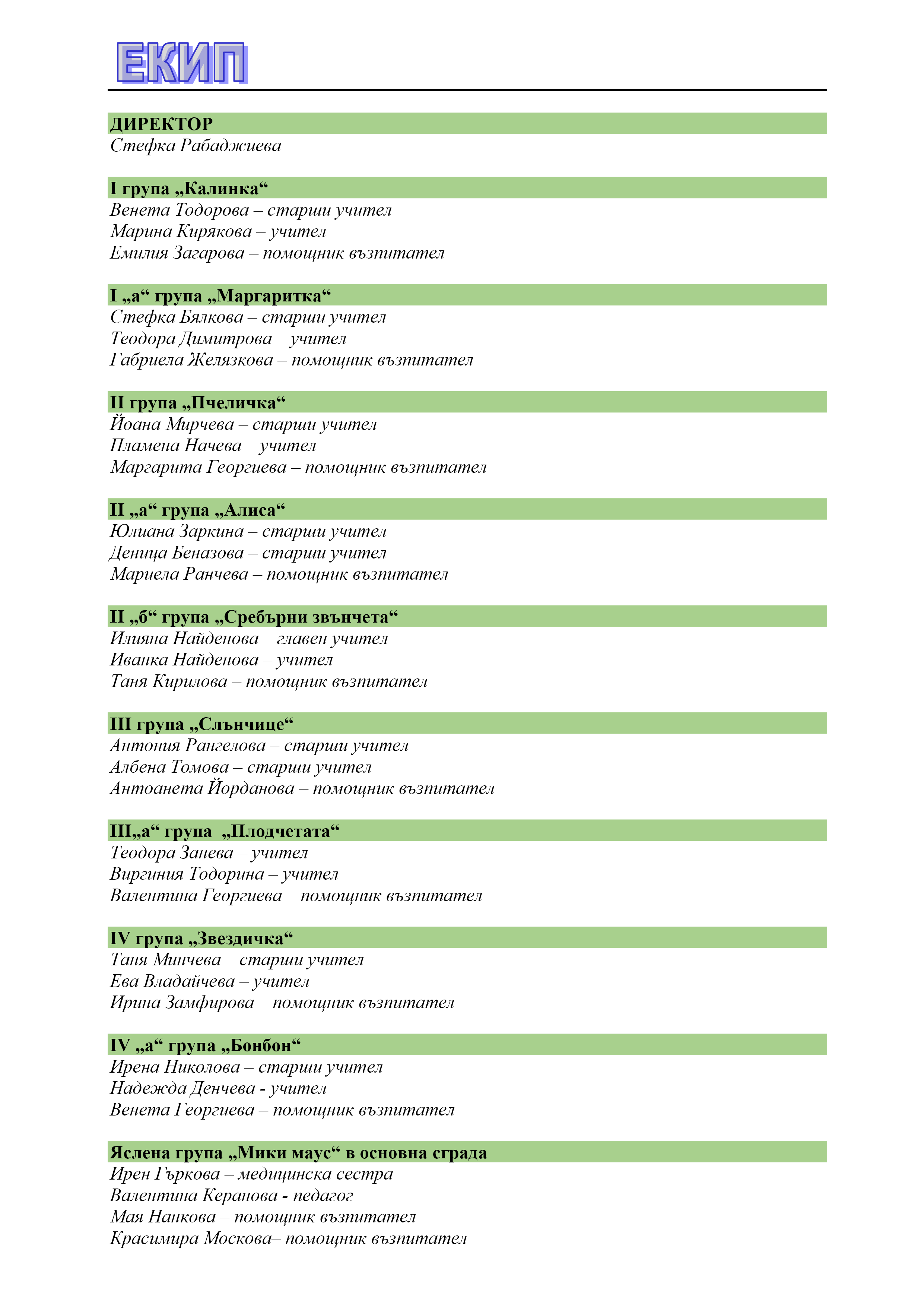 За децата се грижи високо квалифициран екип от педагогически специалисти, медицински сестри, психолог, логопед, ресурсен учител и помощник-възпитатели.